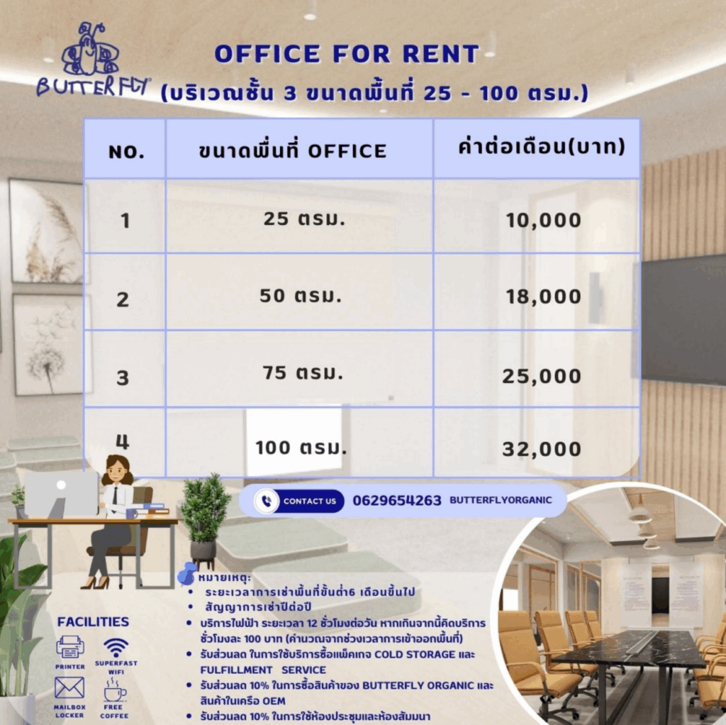 หากกำลังมองหาหรือต้องการออฟฟิศให้เช่า อยากเช่าสำนักงาน ที่มีคุณภาพ มาตรฐาน Butterfly Organic เรามีออฟฟิศที่มีพื้นที่ที่ตอบโจทย์ทุกความต้องการของคุณ พร้อมด้วยแพ็กเกจราคาที่ยืดหยุ่น บริการและดูแลอย่างมืออาชีพ เพื่อให้มั่นใจว่าการทำงานของคุณในออฟฟิศที่เราดูแล จะเป็นไปอย่างราบรื่นและมีประสิทธิภาพสูงสุด หากสนใจสอบถามข้อมูลเพิ่มเติมติดต่อได้ที่โทรศัพท์ 062 965 4263 ไม่เพียงเท่านั้น ที่ Butterfly Organic ยังมีบริการอื่น ๆ เช่น OEM ให้คุณสามารถสร้างแบรนด์ของตัวเองได้ จากผลิตภัณฑ์ออร์แกนิคหลายอย่าง เช่น ออร์แกนิค กรีก โยเกิร์ต  น้ำนมโคออร์แกนิค