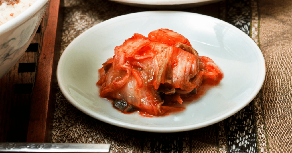กิมจิเป็นผักหมักที่มีจุลินทรีย์ดีสูง ทานคู่กับข้าวและโปรตีนอย่างไข่ต้ม จะได้มื้ออาหารที่อิ่มท้องและดีต่อลำไส้ แนะนำใส่กิมจิแบบสด ที่ไม่ผ่านความร้อนสูง